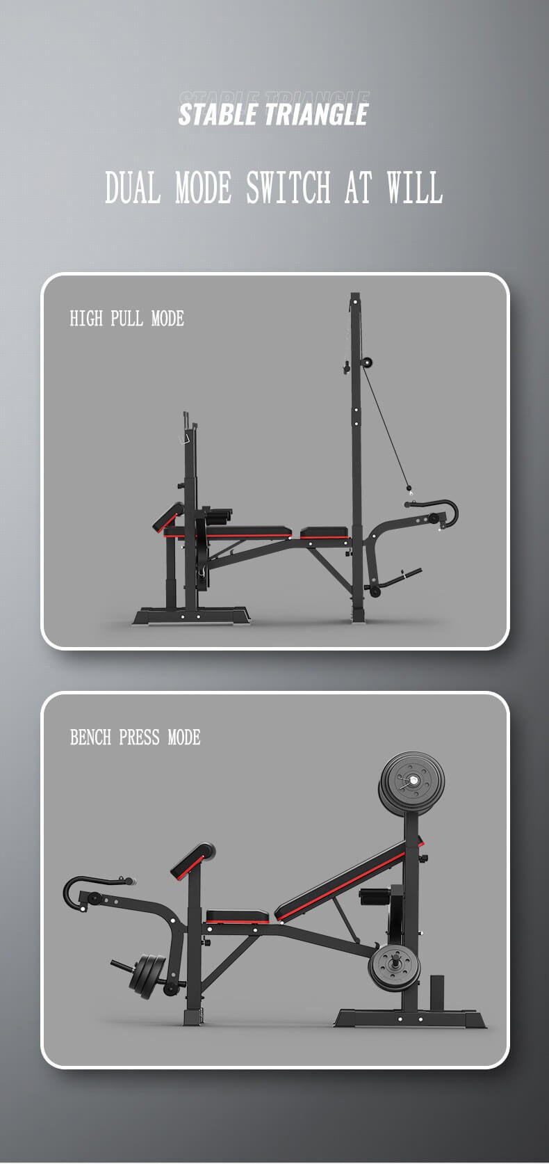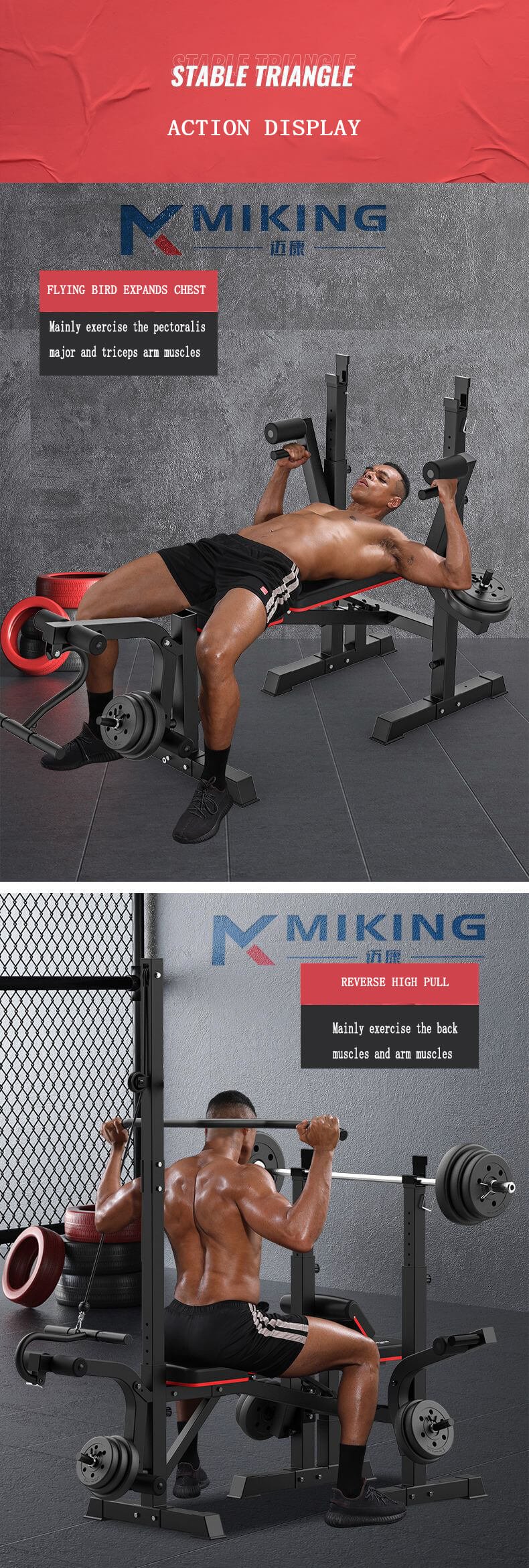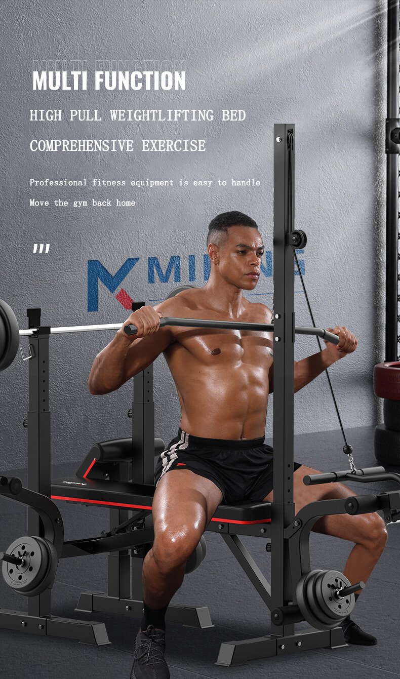The frame of the MK-001 High Pull Bar Weightlifting Bed is constructed from heavy-duty steel tubing, reinforced at key stress points to withstand repeated high-intensity usage. The integrated high pull bar structure expands training functionality, allowing users to perform both bench press movements and upper-body pulling exercises within a single station. This multifunctional design helps optimize space utilization in commercial gyms and professional training centers.